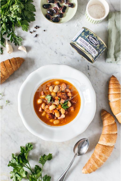 Zloženie: Pitná voda, údené bravčové plece (SK) 9,6%, údená klobása (SK) 9,6 % (bravčové a hovädzie mäso /na 100 g hotového výrobku bolo použité 114 g bravčového mäsa a 18 g hovädzieho mäsa/, prírodné koreniny, cukor kryštál), fazuľa biela 8,4 %, cibuľa, mrkva, zemiakový škrob, bravčová masť, cesnak, červená paprika mletá, slepačí bujón, jedlá sol', petržlenová vňať, čierne korenie.