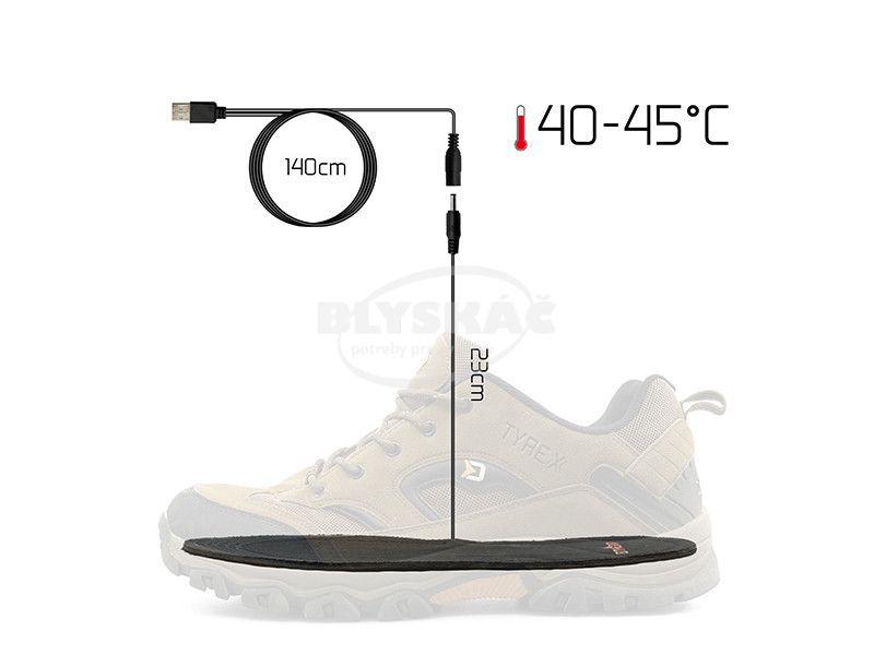 Univerzálna veľkosť 40-46 umožní použite pri širokej škále veľkosti obuvi. Vložky po pripojení pomocou USB koncovky do power banky, alebo iného zdroju elektrickej energie (neodporúčame pripojenie vložiek priamo do elektrickej siete), dokážu vyhriať vnútro vašej topánky do teploty 40-45°C. To oceníte najmä počas zimných dní či už pri chôdzi alebo pri dlhšom zotrvaní na jednom mieste počas lovu. K maximálnemu komfortu prispieva aj príjemný mäkký materiál, z ktorého sú vyrobené. Po odpojení od zdroja teplota vložiek pomaly klesne.