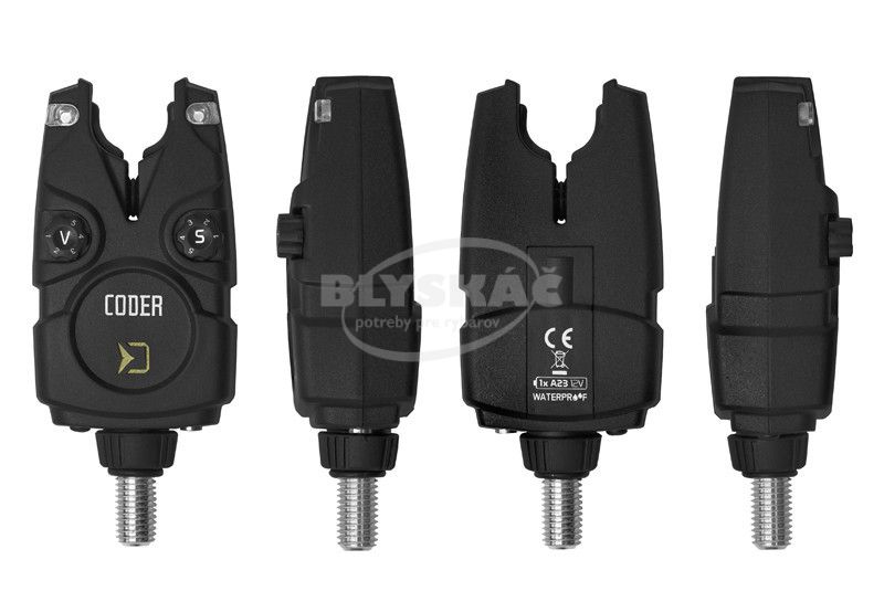 Signalizátor je napájaný 1x12V batériou typu LR23A, ktorá disponuje dostatočne dlhou výdržou. V prípade slabej batérie vás signalizátor upozorní krátkym pípnutím. Pomocou spínača “V“ je možné vybrať jednu z 5. úrovní hlasitosti, vrátane tichého módu. Taktiež si je možné navoliť požadovaný tón a úroveň citlivosti (v rozmedzí 1-9cm), ktoré majú rovnako 5 rôznych úrovní. Nespornou devízou signalizátorov zo sady CODER je možnosť výberu spomedzi 7 farieb signalizačnej LED diódy. Každý si tak vyberie svoju obľúbenú a pokiaľ zatúžite po zmene, tak si jednoducho zvolíte inú farbu podľa návodu. Na spätný záber vás upozorní odlišný tón a po každom zábere sa rozsvieti na dobu 15 sekúnd pamäťová dióda. V spodnej časti sa nachádza vstup pre 2,5 mm konektor pre pripojenie svietiaceho indikátora. Počas nočného lovu je možné zapnúť taktiež pozičnú diódu.